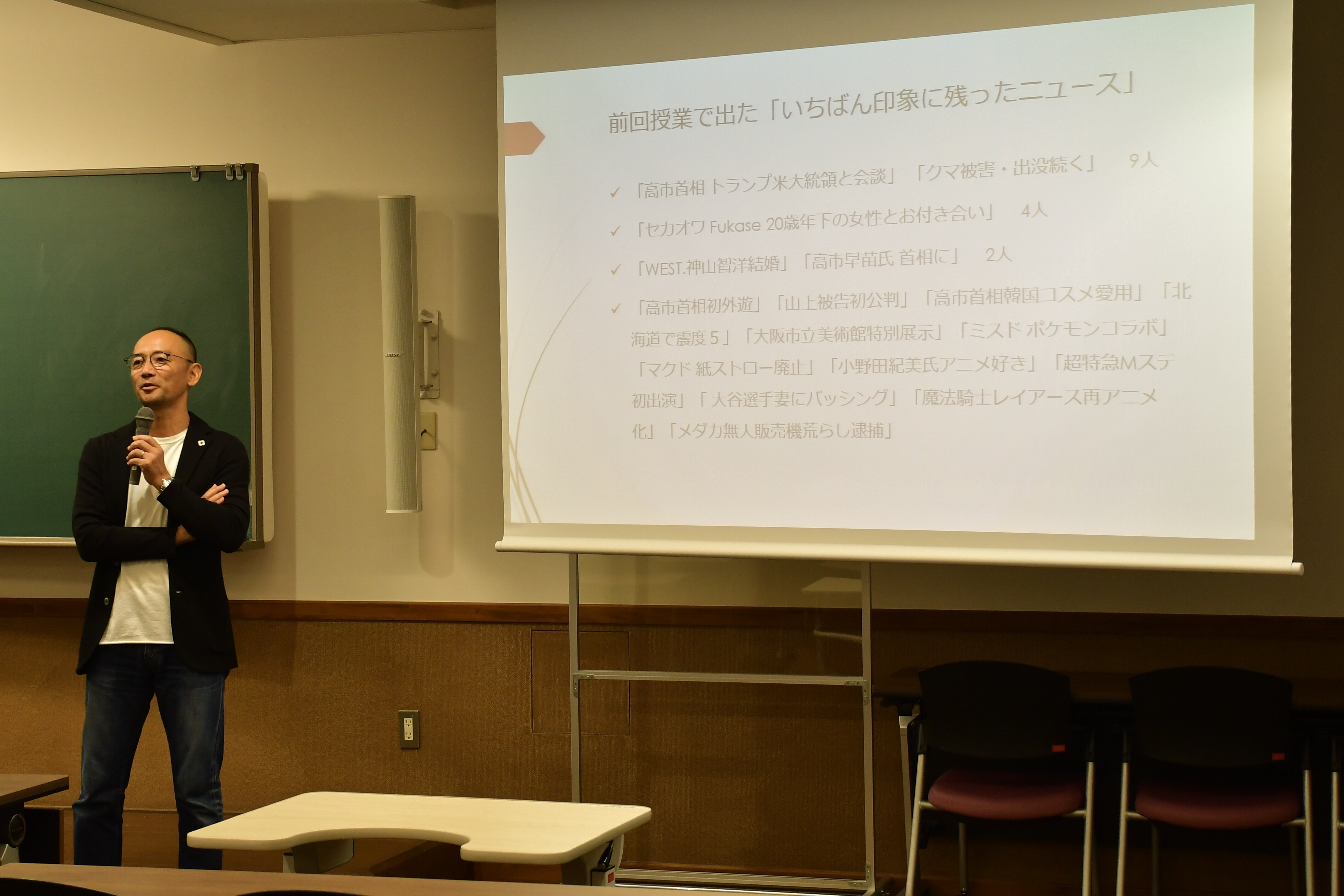 授業は「この1週間でもっとも印象に残ったニュースをひとつ挙げる」という問いかけから始まり、学生たちはそれぞれの視点で印象に残ったニュースを書き出すことから始まりました。